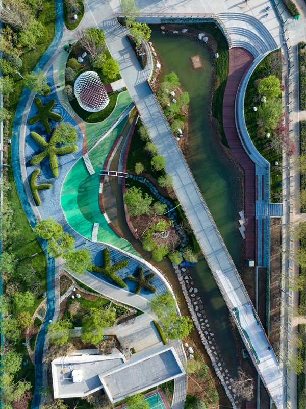 丝路创智谷整体采用园林式布局,运用“融山引水”的策略随势赋形,将绵延的秦岭群山的印象延续至项目,北侧采用起伏的绿坡进行堆坡造景,借助湖面自然景观,形成良好的观景视野。可以自由漫步的屋顶花园以及面向未来之瞳的空中露台,在垂直立面形成了错落有致的绿廊景观,营造出一个具有创新性和文化性的城市绿洲。项目南望秦岭,永安渠海绵城市生态公园、未来之瞳·瞳湖公园、大仁遗址公园等生态公园群落环绕,自然资源优越,为文化创意相关工作人员营造舒适的工作及生活环境,将自然景致融于日常。