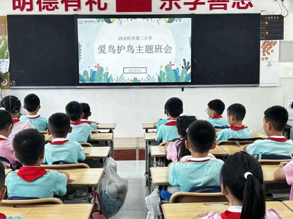 在西安经开第二小学,学校充分发挥课堂主阵地作用,积极召开“爱鸟护鸟,你我同行”主题班会,特别开设了鸟类保护专题知识课堂,老师通过生动的讲解、精美的图片和视频,向同学们系统普及了鸟类的种类、生活习性、在生态系统中的重要作用等科学知识,引导学生关注身边飞翔的精灵,让“依法护鸟”的法治观念深深植根于学生心中。
