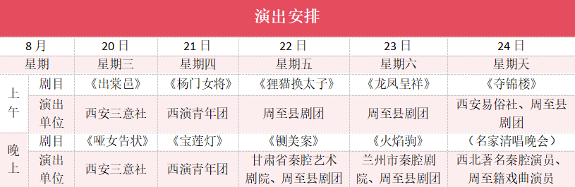 本次精品剧目展演深度呼应“秦岭·秦人·秦声”主题,精心遴选多部思想精深、艺术精湛、制作精良的秦腔传统经典与优秀剧目。届时,两社三团联动,五天十场大戏,名家新秀联袂,在水街独特的自然与人文景观中,演绎荡气回肠的忠义传奇与质朴动人的百姓故事。拟上演剧目包括三意社秦腔扛鼎之作《出棠邑》《哑女告状》、易俗社与周至县剧团联合演出《夺锦楼》、周至县剧团与甘肃省秦腔院团联合演出《铡美案》《火焰驹》、西演青年团演出《杨门女将》《宝莲灯》、周至县剧团演出《狸猫换太子》《龙凤呈祥》等 9 本大戏+西北著名秦腔演员、周至籍戏曲演员名家清唱晚会,让秦腔戏迷过足戏瘾。