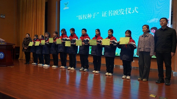 “版权种子计划”证书颁发仪式上,活动主办单位为阎良区第一中学10名优秀学生代表颁发版权证书,进一步激发了广大青少年尊重原创、保护版权的思想自觉与行动自觉,让版权保护的种子在青少年心中生根发芽,助力培育创新型时代新人。