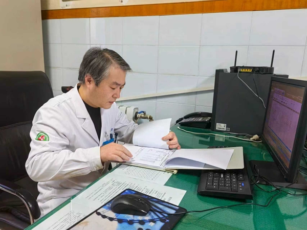 一上午,诊室的门开开合合,听诊器始终搭在肩头。门诊结束后,他并没有下班,匆匆吃完饭,又折返住院部,翻阅了解今天新入院5位病人的资料。