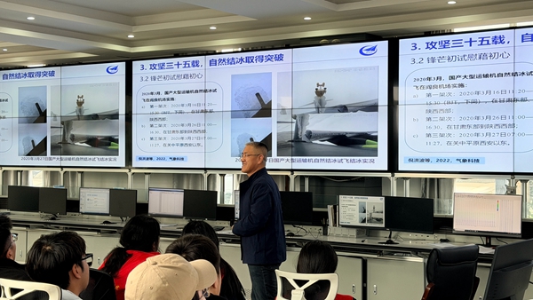 中国飞行试验研究院场务部气象台专家倪洪波以《追风逐雨守望起飞线 潜心守护铁鹰向深蓝》为题,结合航空试飞一线工作经验,生动阐释了气象条件对飞行安全与科研试飞的关键作用,用真实故事诠释“气象是航空飞行的生命线”,让航空报国的种子在青年们心中扎根。