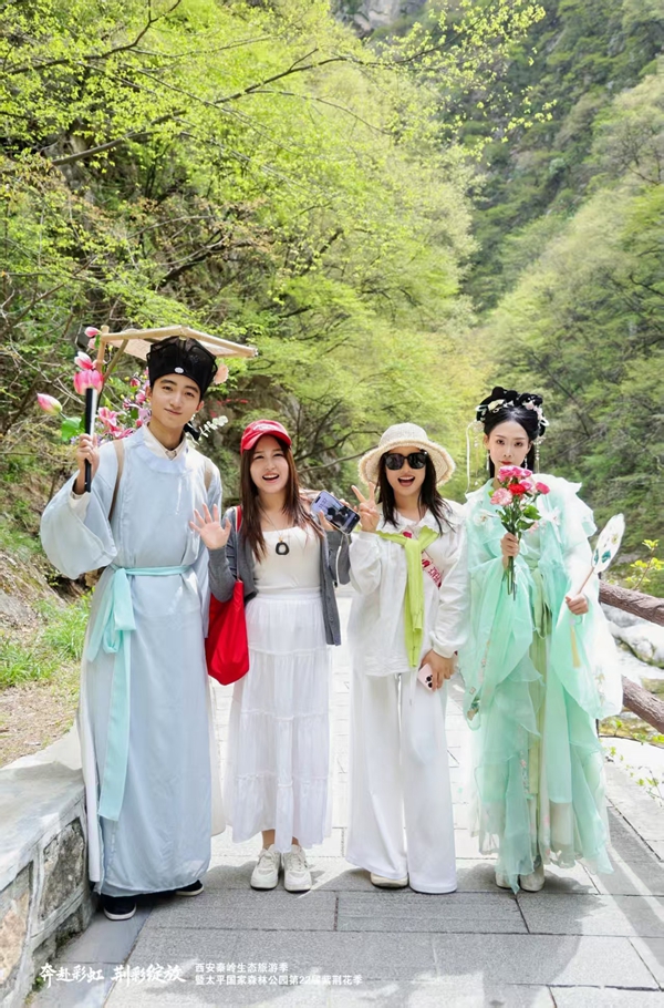 启动仪式在花神NPC互动中拉开帷幕,“花神”翩然现身,与游客对诗赠花,以一场诗意邂逅开启生态旅游季的华美篇章。作为秦岭生态旅游季的重要组成部分,本次活动以“春游嘉年华”为核心理念,在延续传统赏花文化品牌的基础上,创新推出“NPC新感官沉浸打卡+动线漫游+服务新体验+异业联动”四大亮点板块,将生态保护与文旅创意深度融合,为游客呈现一场多维度的沉浸式生态旅游新体验。