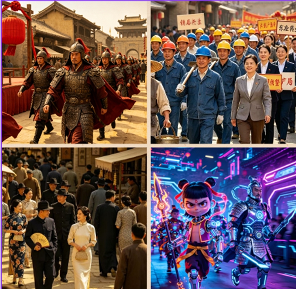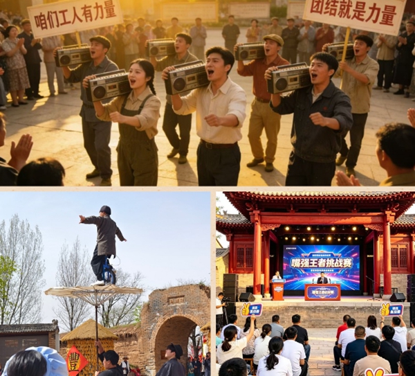 二虎广场,《大风鼓曲舞》气势恢宏;秦潮舞会、秦人制燥livehouse接连登场,传统演艺与现代潮流碰撞,氛围感拉满。白鹿村戏台化作百姓大舞台,不同年代的劳动者身着特色劳动服,通过农具展示、舞蹈快闪等形式,共同欢庆这一盛大节日,致敬所有劳动者,传递社会正能量,弘扬劳动精神。白鹿村、滋水县城、文昌阁、科技区各有特色,民俗快闪、杂技互动、将军点兵、赛博体验相映成趣,让游客沉浸式穿越古今。